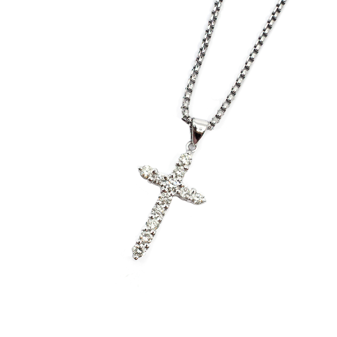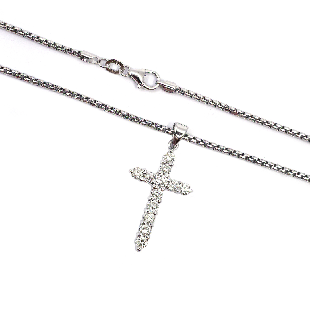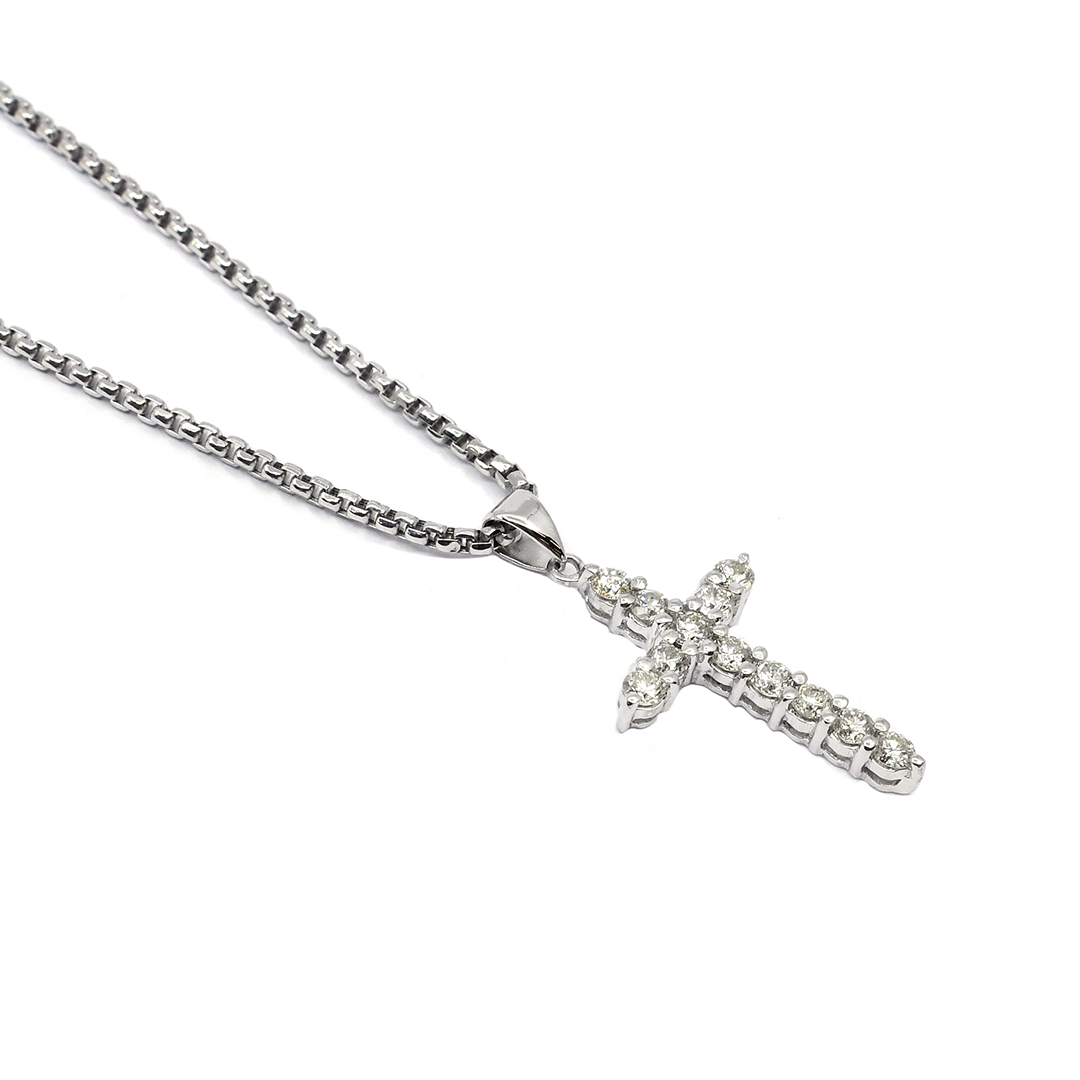 14K White Gold Box Chain Necklace and Pendant with Round Cut Diamonds
