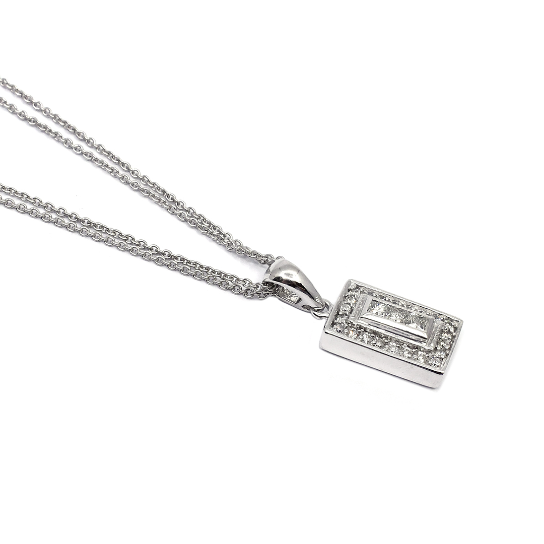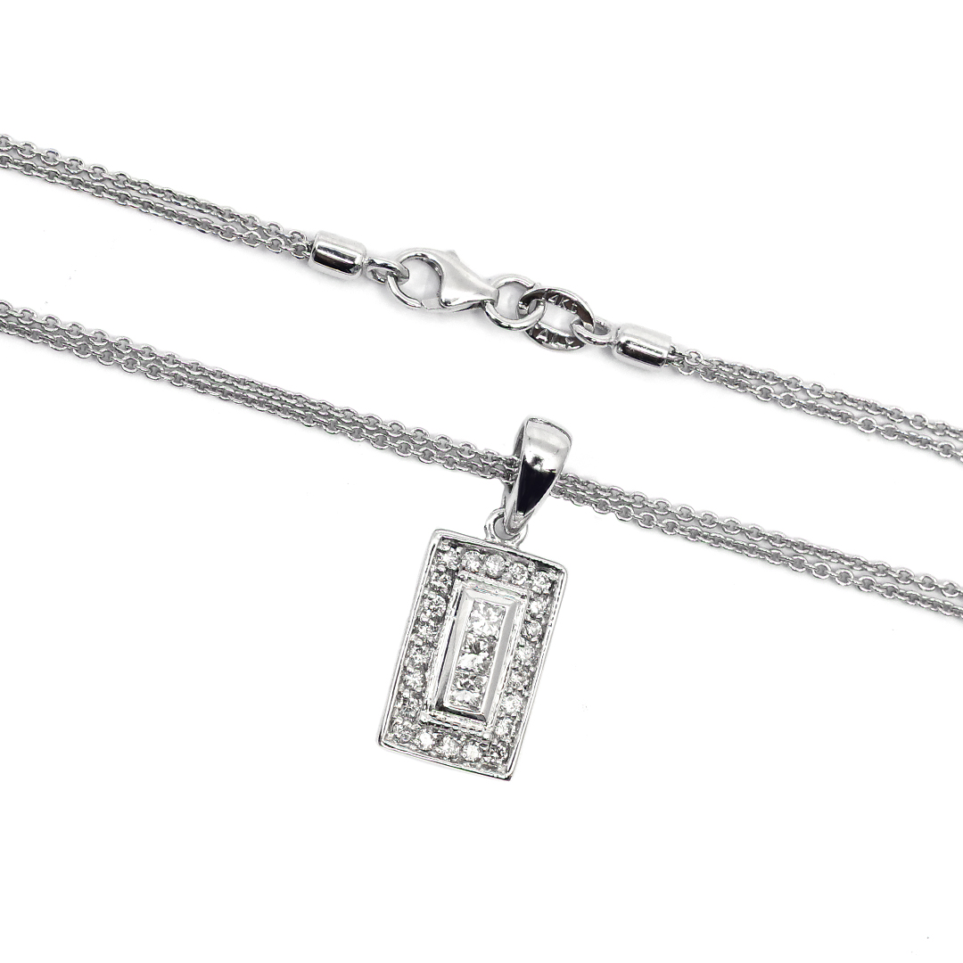14K White Gold Link Chain Necklace and Pendant with Princess and Round Cut Diamonds