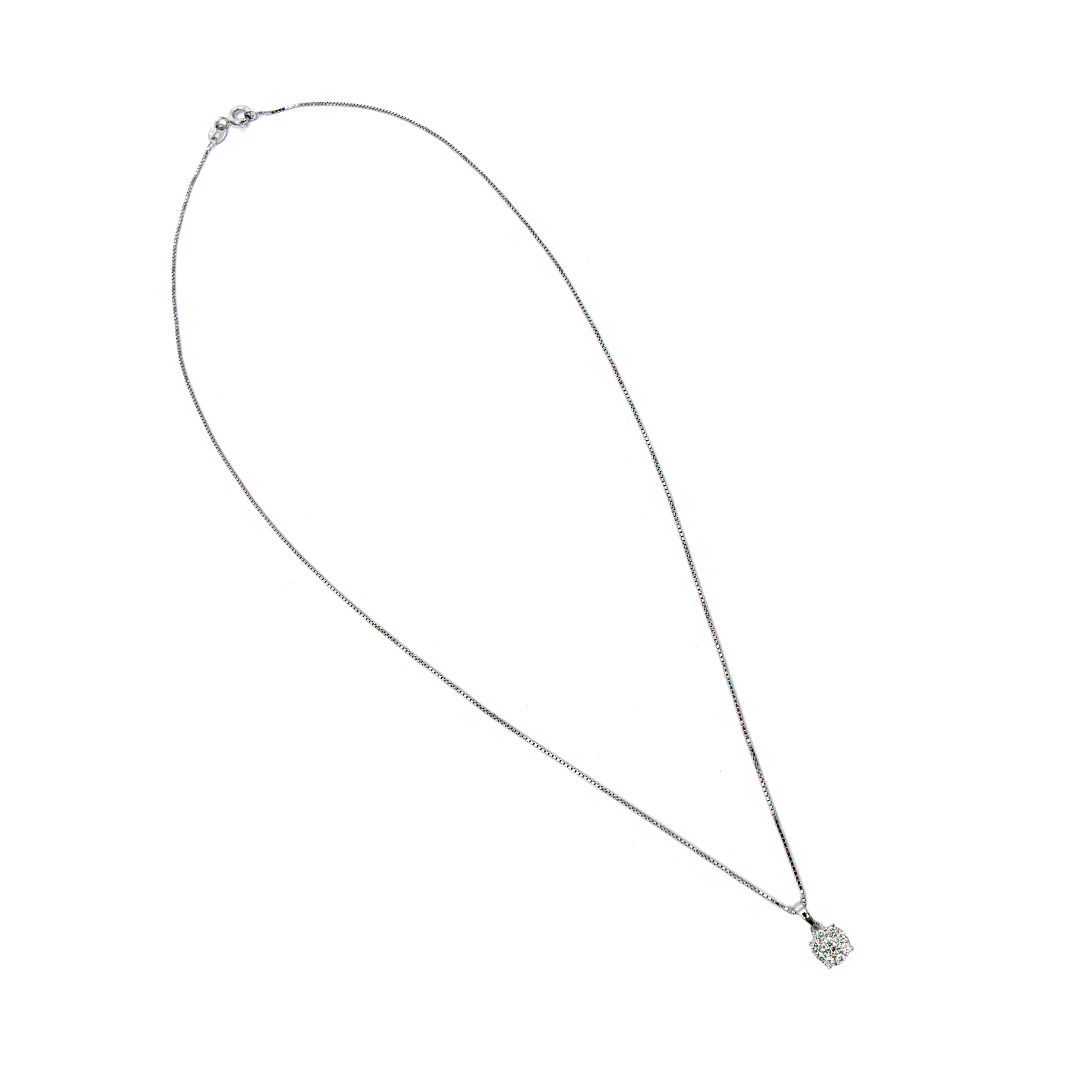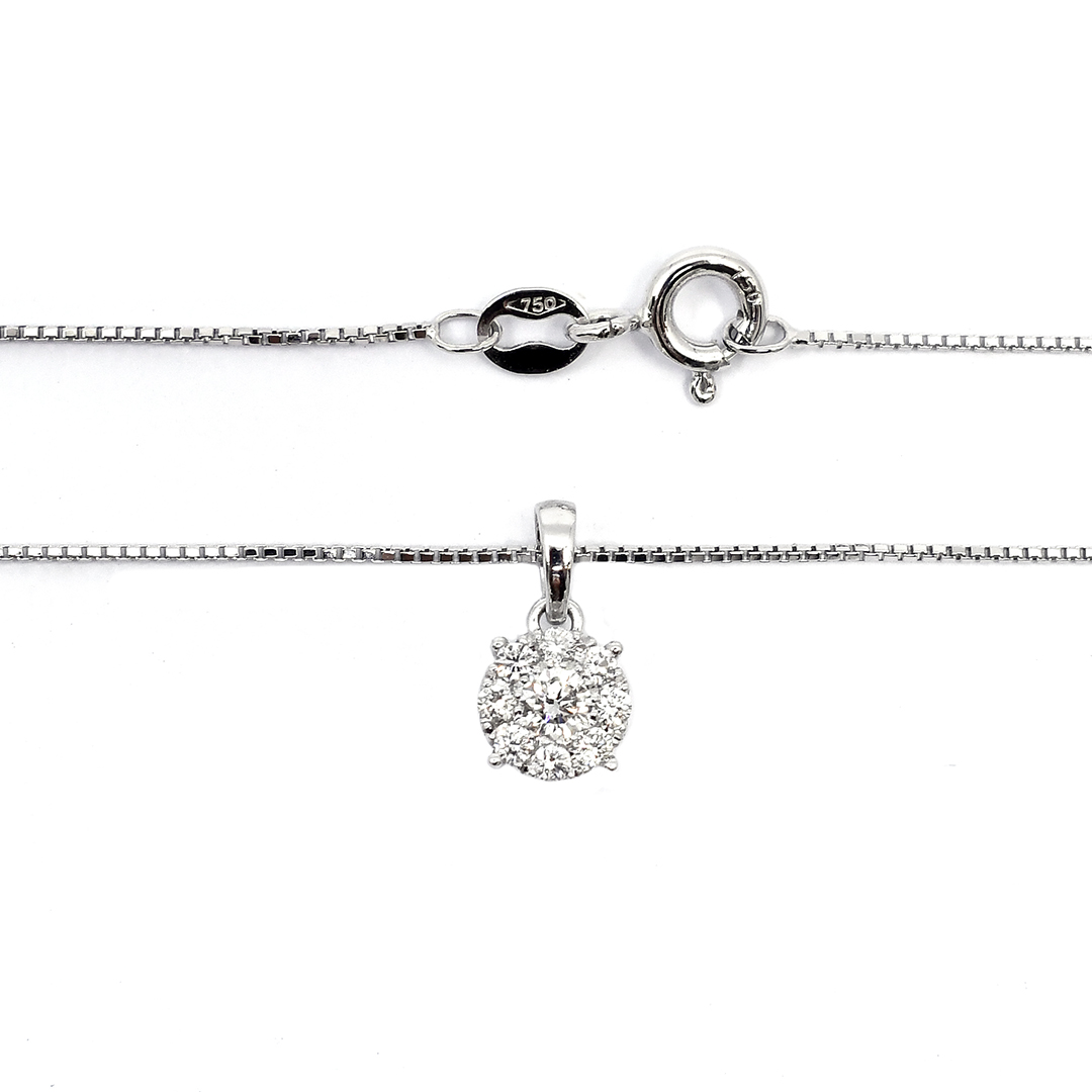 18K White Gold Box Chain Necklace and Pendant with Round Cut Diamonds