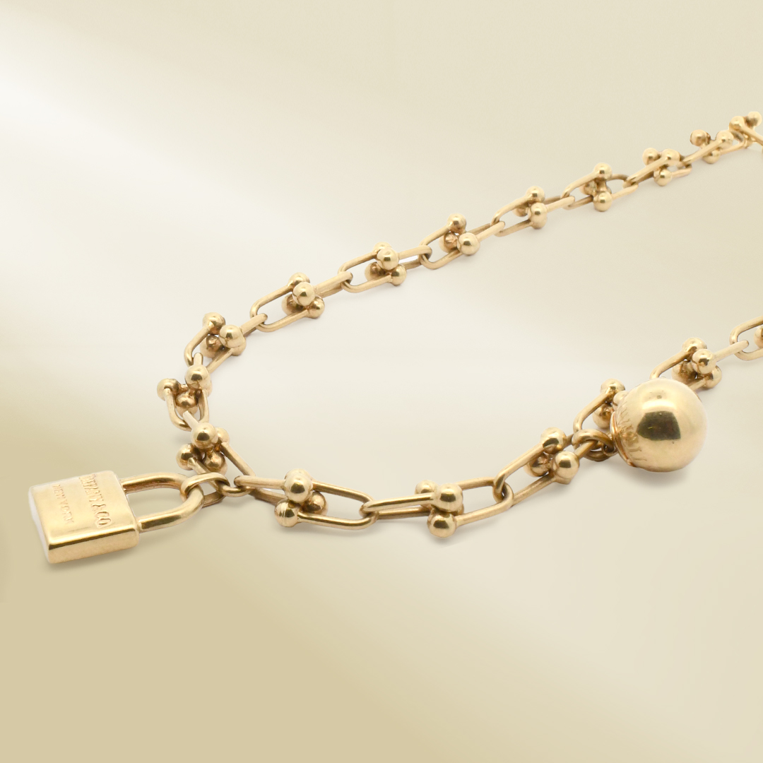 18K Yellow Gold Brand-Inpired Chain Necklace with Ball Dangle and Brand-Inspired Pendant