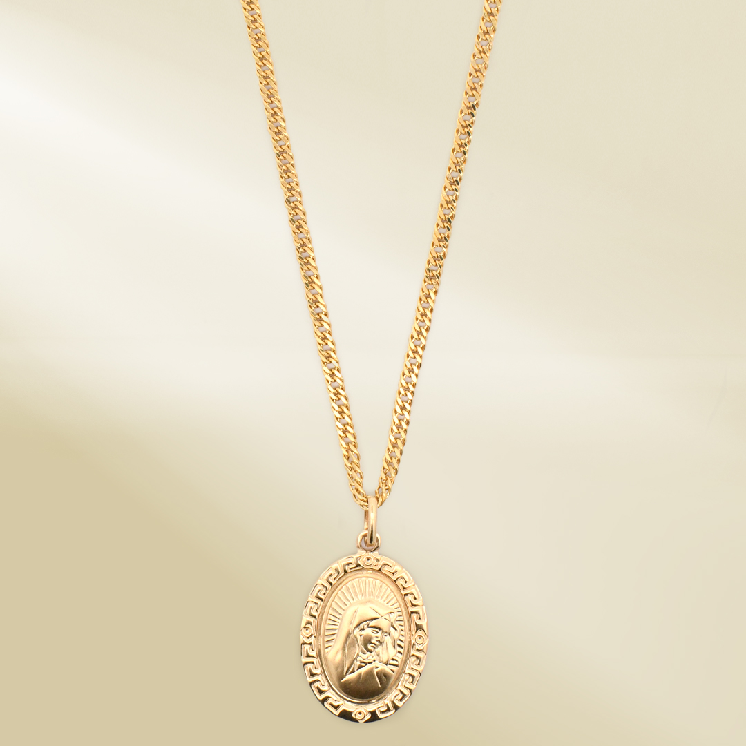 18K Yellow Gold Curb Chain Necklace with Mother Mary Pendant
