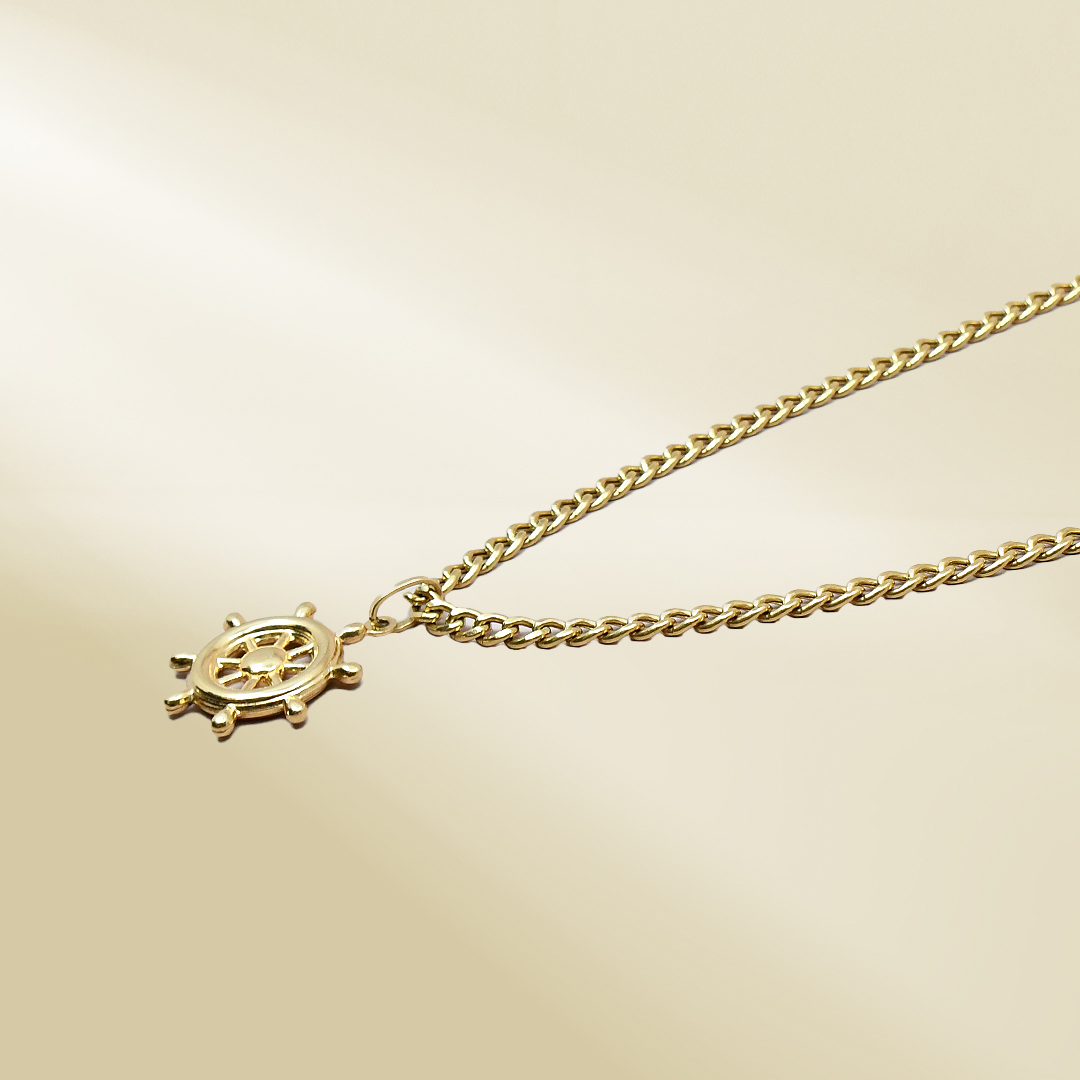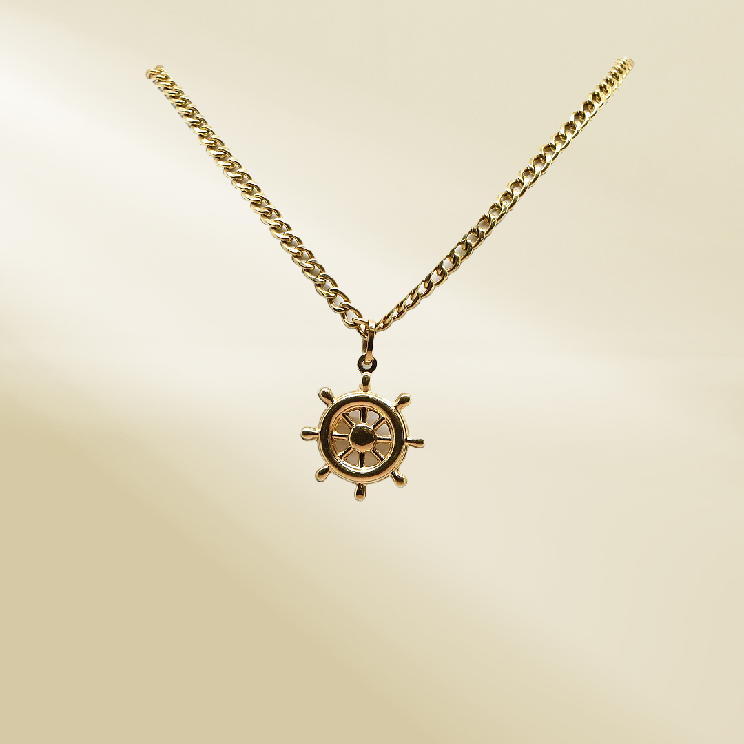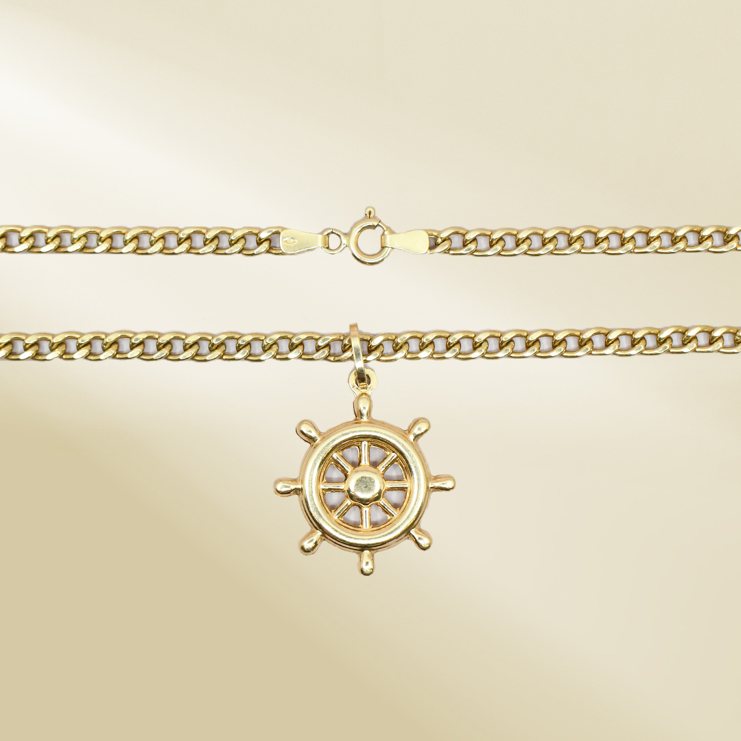 18K Yellow Gold Curb Chain Necklace with Steering Wheel Pendant