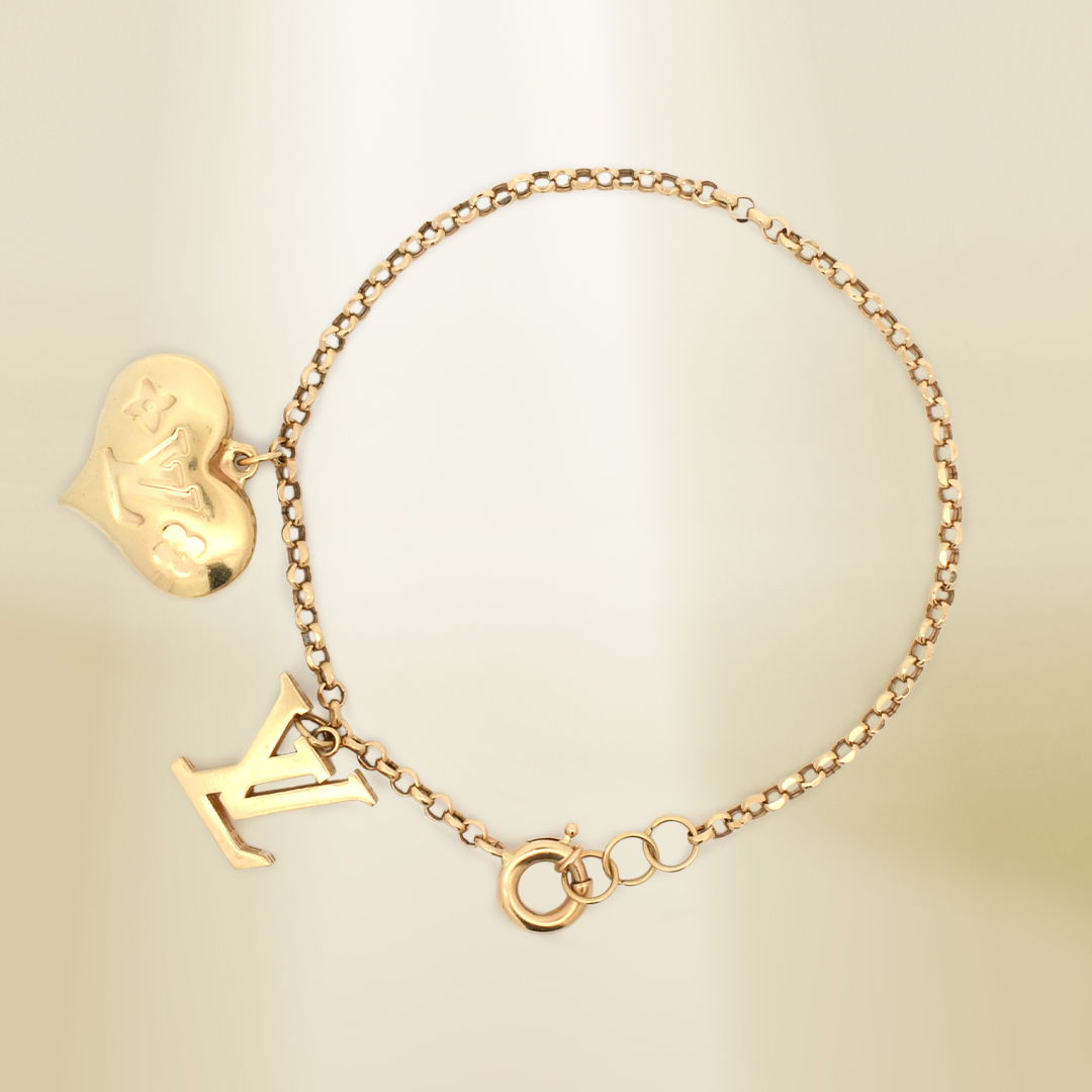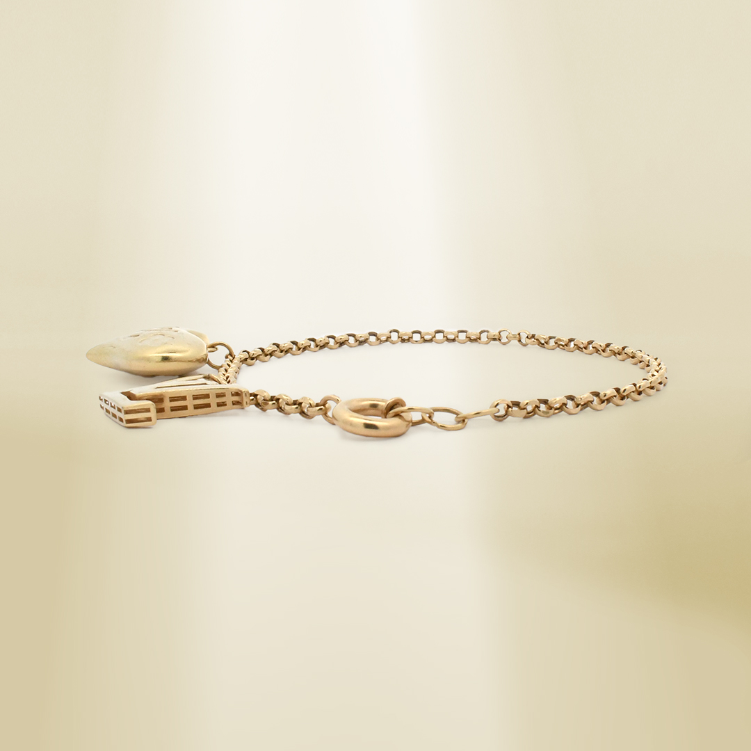 18K Yellow Gold Rolo Chain with Heart and Brand-inspired Charm Bracelet